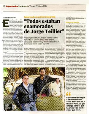 "Todos estaban enamorados de Jorge Teillier" [artículo] / Juan Carlos Ramírez F. La Segunda (Diario : Santiago, Chile) marzo, 27, 2015, p. 38-39 .