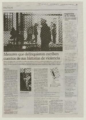 Menores que delinquieron escriben cuentos de sus historias de violencia [artículo] / Patricio Carrera. La Tercera (diario: Santiago, Chile)-- abr. 10, 2010, p. 33. .