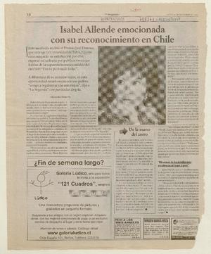 Isabel Allende emocionada con su reconocimiento en Chile [artículo] / Marcela Soto O. La Segunda (Diario : Santiago, Chile)-- dic. 4, 2003, p. 38. .