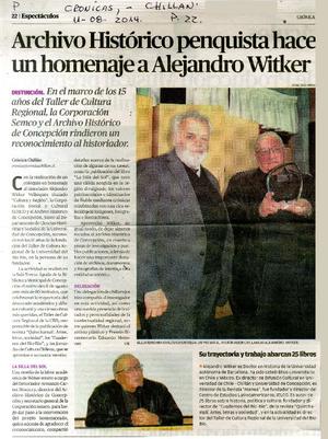 Archivo histórico penquista hace un homenaje a Alejandro Witker [artículo]. Crónica Chillán (Diario : Chillán, Chile)-- ago. 11, 2014, p. 22. .