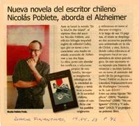 Nueva novela del escritor chileno Nicolás Poblete, aborda el Alzheimer. [artículo] Diario Financiero (Diario : Santiago, Chile)-- abr. 19, 2013, p. 46 .