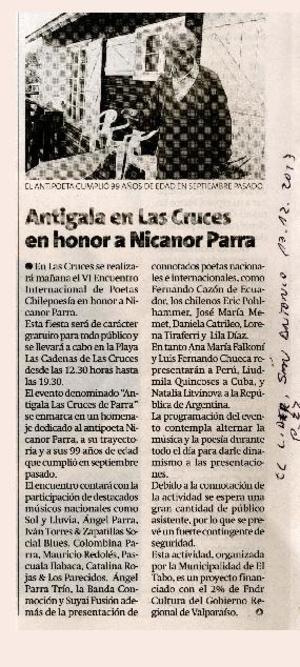 Antigala en Las Cruces en honor a Nicanor Parra [artículo] / El Lider (Diario : San Antonio, Chile)-- dic. 13, 2013, p. 22 .