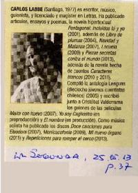 Carlos Labbé. [artículo] La Segunda (Diario : Santiago, Chile)-- mayo 25, 2013, p. 37. .