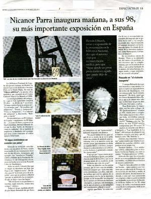 Nicanor Parra inaugura mañana, a sus 98, su más importante exposición en España [artículo] / La Segunda (Diario : Santiago, Chile)-- may. 29, 2013, p. 33 .