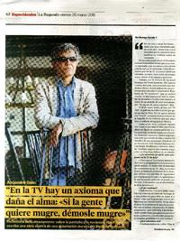 "En la TV hay un axioma que daña el alma: "Si la gente quiere mugre, démosle mugre"" [artículo] Rodrigo Garrido T. La Segunda (Diario : Santiago, Chile) marzo 20, 2015, p. 42-43 .