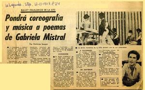 Pondrá coreografía y música a poemas de Gabriela Mistral [artículo] / Patricia Souper Quinteros. La Segunda (Santiago, Chile)-- feb. 17, 1977, p. 24. retr. .
