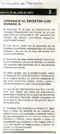 Homenaje al escritor Luis Durand D. [artículo] / Johnny Sepúlveda. La Gaceta de Traiguén (Diario : Santiago, Chile)-- jul. 24, 2003, p. 3. .