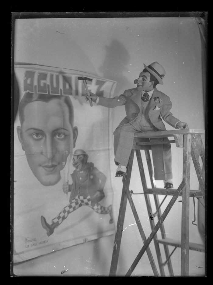 [El muñeco don Pánfilo arriba de una escalera colocando un cartel anunciando a Agudiez] [fotografía] Alfredo Molina Lahitte