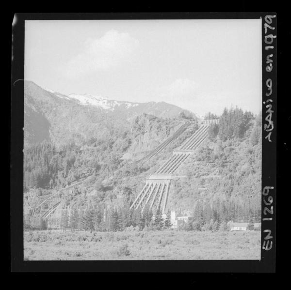 [Vista de las cañerías metálicas que conducen el agua de la cámara de carga a la casa de máquinas, en caida casi vertical de 120 m.] [fotografía] Luis Ladrón de Guevara.