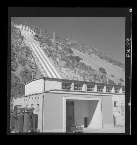 Aspectos de la central y su entorno : edificio de 10.000 m2 y las 5 tuberías de 52 m. de longitud, 3 de ellas tienen 2,30 m. de diámetro y las restantes 3,70 m. diámetro [fotografía] Luis Ladrón de Guevara.