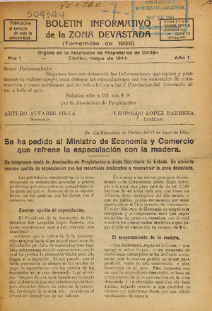 Boletín informativo de la zona devastada. Organo de la Asociación de Propietarios de Chillán Chillán : La Asociación, 1946-1953 (Chillán : Impr. Americana) 26 nos. ; 27 cm. .