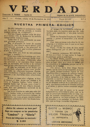 Verdad. Chillán : [s.n.], 1942-1944 (Chillán : Impr. Americana) 22 nos. : il. ; 27 cm. .