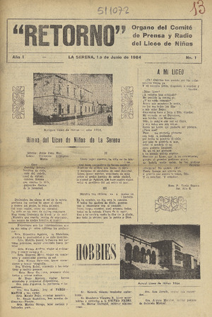 Retorno / órgano del Comité de Prensa y Radio del Liceo de Niñas. La Serena : El Comité, 1964 (La Serena : Impr. de El Día) 3 nos. : il. ; 38 cm. .