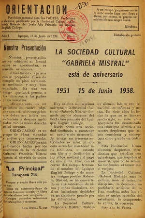 Orientación / publicado por la Sociedad Cultural Gabriela Mistral del sexto año primario del Iquique English College. Iquique : La Sociedad, 1938 (Iquique : Impr. Victoria) 2 nos. ; 27 cm. .