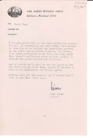 [Carta] 1971 Apr. 13, The Johns Hopkins Press, Baltimore, Maryland 21218, [EE.UU.] [a] Doris Dana [manuscrito] / Lisa Johns. 1 h. ; 22 cm. + 1 h. (28 cm.) .