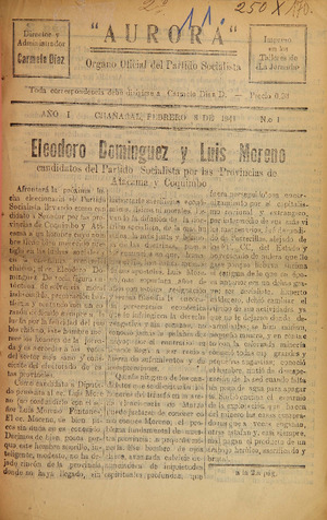 Aurora / Organo Oficial del Partido Socialista. Chañaral : [s.n.], 1941 ([s.l.] : Tall. La Jornada) 5 nos. ; 28 cm. .