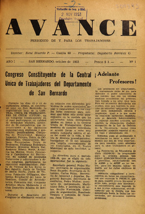 Avance. San Bernardo : [s.n.], 1953 (San Bernardo : Impr. Lautaro) 1 no. ; 34 cm. .