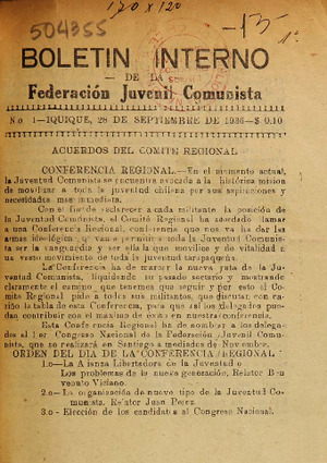 Boletín interno de la Federación Juvenil Comunista. Iquique : La federación, 1936 (Iquique : Impr. Occidente) 1 no. ; 19 cm. .