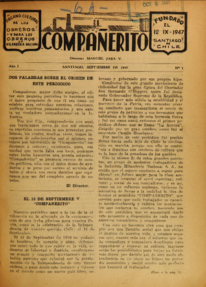 Compañerito. Santiago : [s.n.], 1947. (Santiago : Impr. El Imparcial) 1 no. ; 27 cm. .