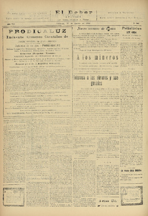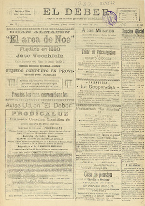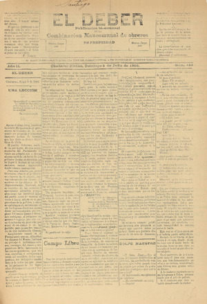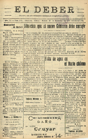El Deber / órgano de la Sociedad Mancomunal de Obreros. Chañaral : La Sociedad, 1904-1944 (Chañaral : El Deber) 14 v. : il. ; 32-57 cm. .