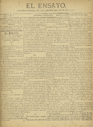 El Ensayo / de los Alumnos del Liceo de Talca. Talca : Los Alumnos, 1882 (Talca : Impr. de Las Novedades) 9 nos.; 34 cm. .