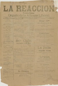 La Reacción / Organo de la Alianza Liberal. Chañaral : La Alianza, 1901-1907 (Chañaral : Impr. de La Reacción) 2 v. ; 47-54 cm. .