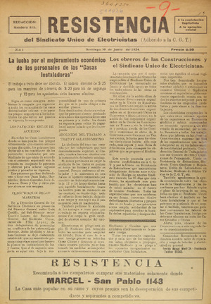 Resistencia / Sindicato Unico de Electricistas (adherido a C.G.T.) Santiago : El Sindicato, 1934 (Santiago : Enc. Leers) 1 no. ; 37 cm. .