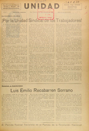 Unidad / voz oficial de la Columna Unidad y Avance del Partido Radical Socialista. Santiago : la Columna, 1940 (Santiago : Impr. imperio) 2 nos. : il. ; 37 cm. .