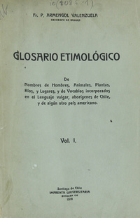 Glosario etimológico de nombres de hombres, animales, plantas, ríos, y lugares, y de vocablos incorporados en el lenguaje vulgar, aborígenes de Chile, y de algún otro país americano. Santiago de Chile :Universitaria,1918. 2 v. ;23 cm.
