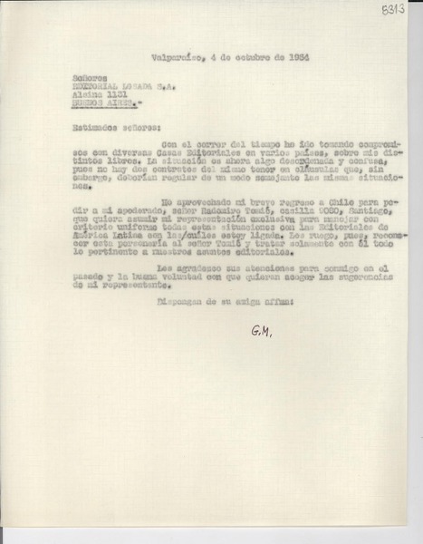 [Carta] 1954 oct. 4, Valparaíso [a] Editorial Losada, Buenos Aires [manuscrito] Gabriela Mistral.