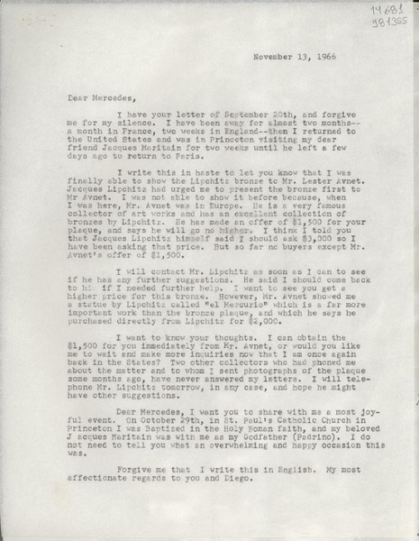 [Carta] 1966 Nov. 13, [Estados Unidos] [a] Dear Mercedes [manuscrito] Doris Dana.
