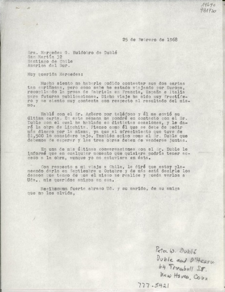 [Carta] 1966 feb. 5, [EE.UU.] [a la] Sra. Mercedes Huidobro de Dublé, San Martín 32, Santiago de Chile [manuscrito] [Doris Dana].