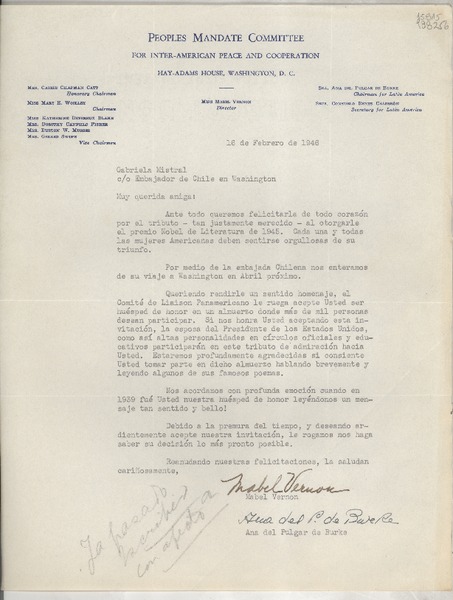 [Carta] 1946 feb. 16, Hay-Adams House, Washington, D. C., [EE.UU.] [a] Gabriela Mistral co Embajador de Chile en Washington, [EE.UU.] [manuscrito] / Mabel Vernon, Ana del Pulgar de Burke.