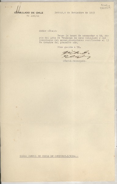 [Oficio] N° 20920, 1935 oct. 22, Madrid, [España] [al] Señor Cónsul de Chile en Comisión, Lisboa, [Portugal] [manuscrito] / Ricardo Reyes Cónsul-Encargado.