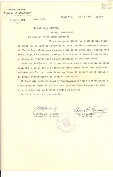 [Carta] 1944 abr. 10, Buenos Aires, [Argentina] [a la] Da. Gabriela Mistral, Petrópolis, Brasil [manuscrito] Pedro B. Franco, José Miguel Speranza.
