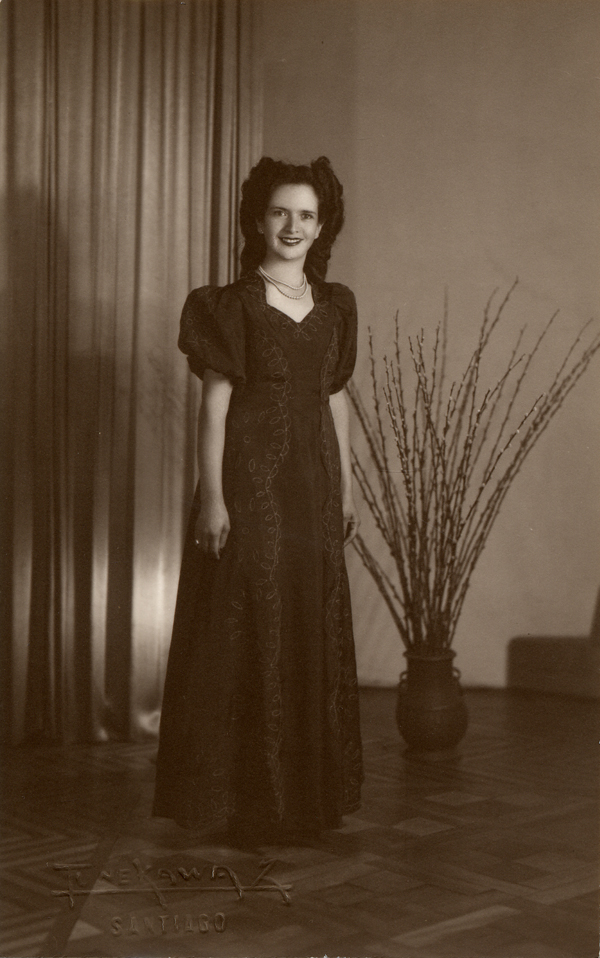 [Mujer joven de pie y vestido largo bordado negro] [fotografía] Kyutaro Tunekawa.