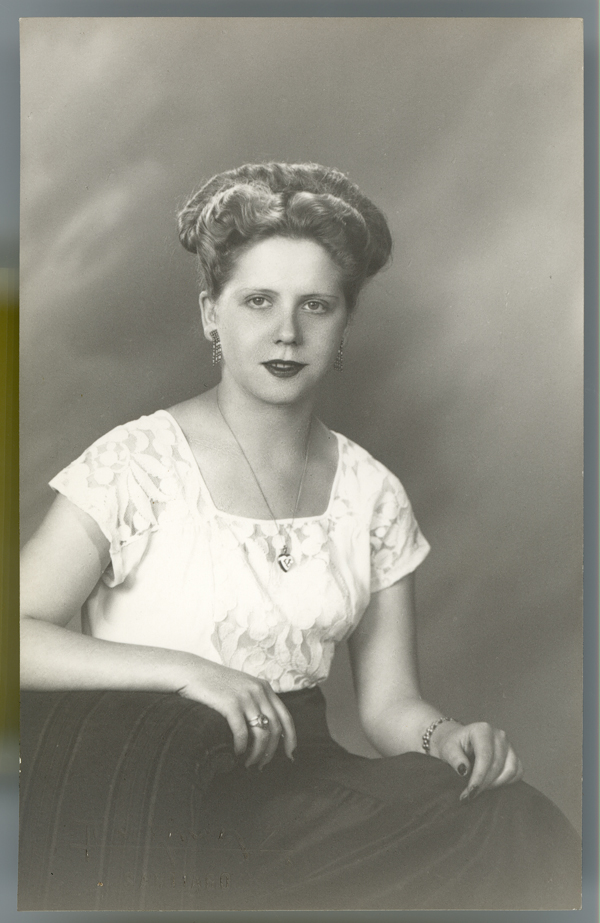 [Mujer joven de pelo claro, blusa de broderí blanca, falda negra amplia, sentada en un sillón de estudio] [fotografía] Kyutaro Tunekawa.