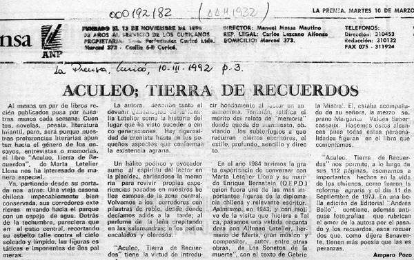 Aculeo, tierra de recuerdos [artículo] Amparo Pozo.