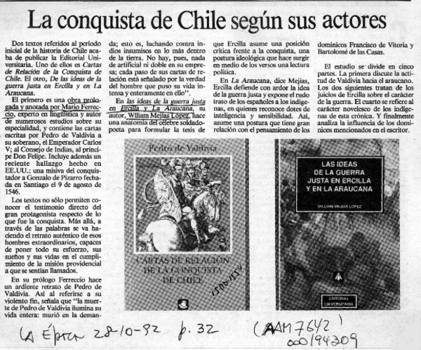 MEJIAS LOPEZ, WILLIAM - VALDIVIA, PEDRO DE - Autores españoles - Autores chilenos - IDEAS DE LA GUERRA JUSTA EN ERCILLA Y LA ARAUCANA - CARTAS DE RELACION DE LA CONQUISTADE CHILE