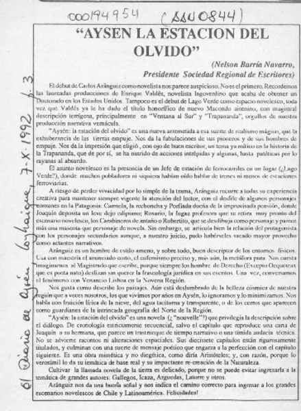 "Aysén, la estación del olvido" [artículo] Nelson Barría Navarro.