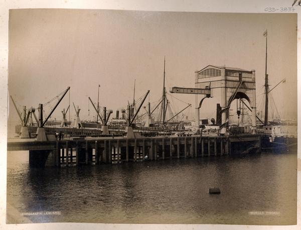 [Vista del muelle fiscal de Valparaíso, se visualizan sus gruas y barcos atracados] [fotografía] Fotografía Leblanc.