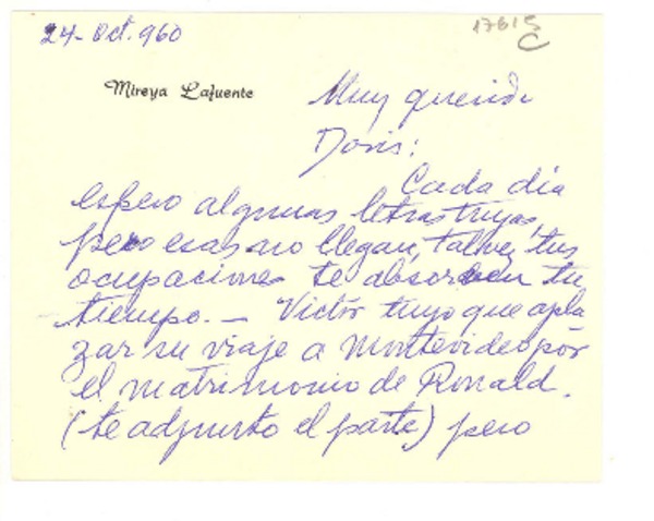[Tarjeta] 1960 oct. 24, Santiago, Chile [a] Doris Dana [manuscrito] Mireya Lafuente.