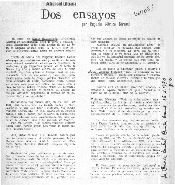 Dos ensayos  [artículo] Eugenio Mimica Barassi.