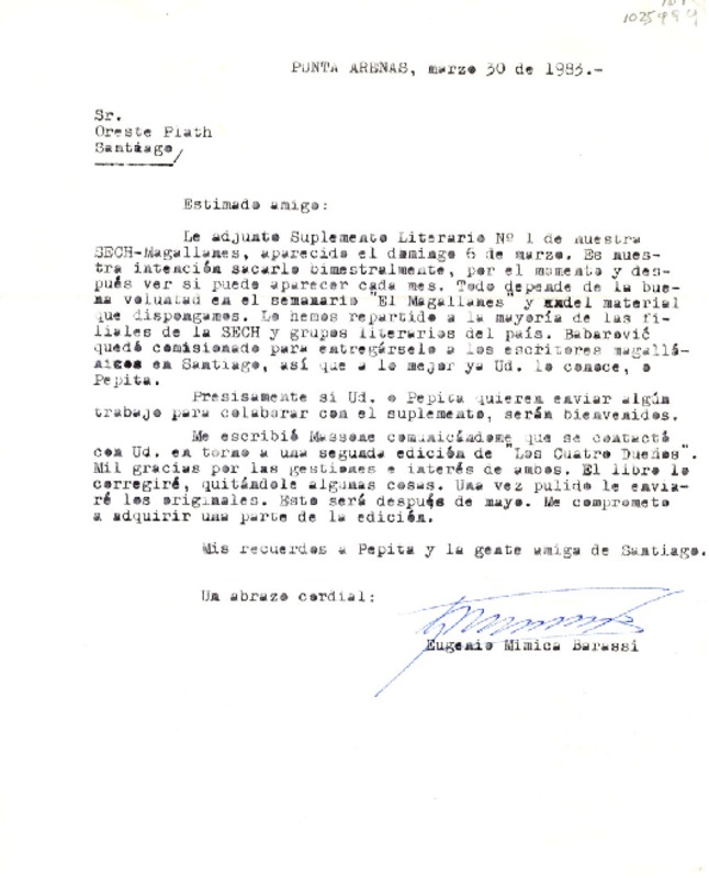 [Carta] 1983 marzo 30, Punta Arenas, Chile [a] Oreste Plath [manuscrito] Eugenio Mimica Barassi.