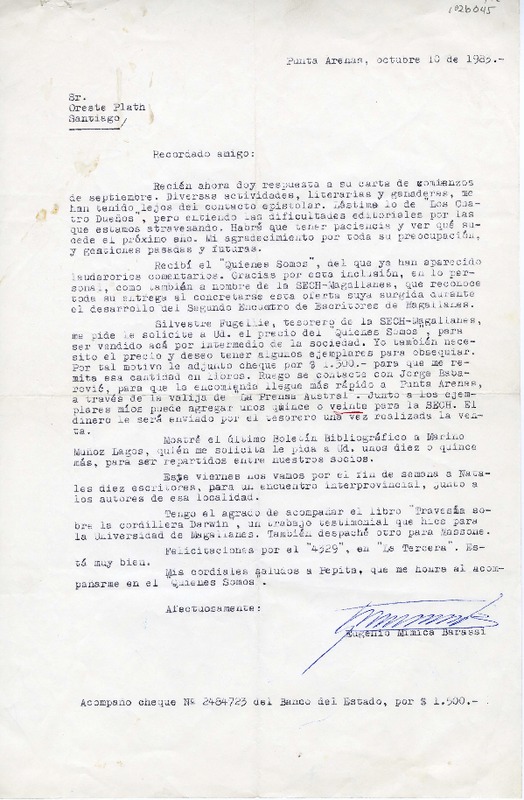 [Carta] 1983 octubre 10, Punta Arenas, Chile [a] Oreste Plath  [manuscrito] Eugenio Mimica Barassi.