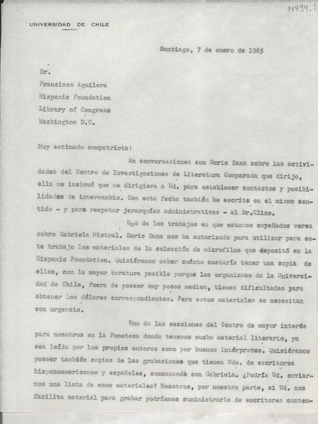 [Carta] 1965 ene. 7, Santiago, [Chile] [a] Dr. Francisco Aguilera, Hispanic Foundation Library of Congress, Washington D.C.