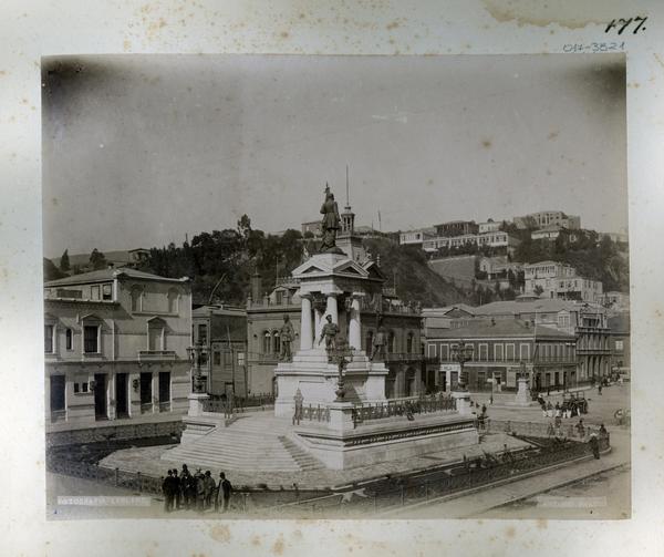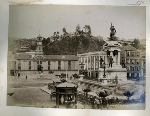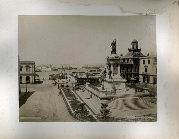 [Monumento a Arturo Prat en Valparaíso, al fondo se divisa el edificio de la Intendencia] [fotografía] Fotografía Leblanc.
