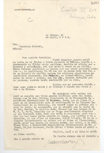 [Carta] 1950 abr. 13, La Habana [a] Gabriela Mistral, México [manuscrito] Juan Marinello.