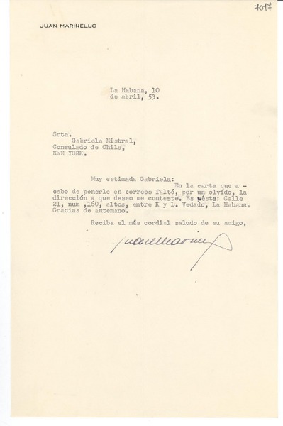 [Carta] 1953 abr. 27, La Habana [a] Gabriela Mistral, New York, U.S.A. [manuscrito] Juan Marinello.