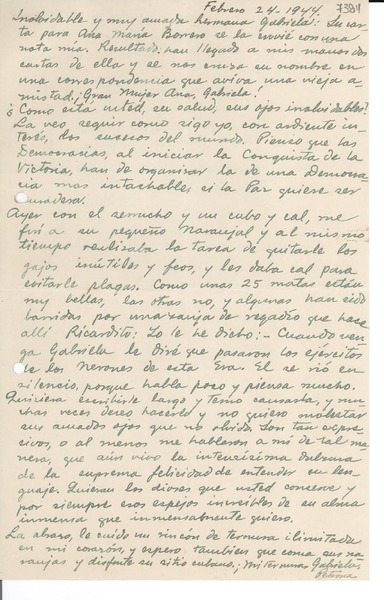 [Carta] 1944 feb. 24 [a] Gabriela Mistral [manuscrito] Petrona Noda.